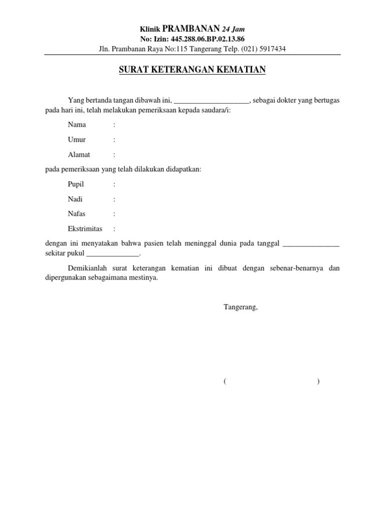Contoh Surat Keterangan Kematian Rumah Sakit Pdf Txt from html.pdfcookie.com Untuk menjaga kesehatan, maka cuti melahirkan dapat diperpanjang sampai paling lama 3 (tiga) bulan, berdasarkan surat keterangan dokter. Jan 18, 2020 · fungsi surat kematian untuk kepentingan pemakaman. Paragraf eksposisi ialah karangan yang menyajikan sejumlah pengetahuan atau informasi Terkadang, untuk pengurusan pemakaman kita membutuhkan surat keterangan kematian dan biasanya surat yang digunakan untuk pemakaman ini dikeluarkan oleh dokter di rumah sakit, rt atau rw setempat atau bisa dari desa. Bagaimanapun orang bukan muslim masih boleh memberikan keterangan kepada mahkamah syariah dalam mencari keadilan. Korban yang berkerja di kafe tersebut, menempati kamar yang khusus untuk para pegawai dan sudah berkerja selama satu bulan terakhir. Apr 01, 2011 · kesalahan tatabahasa 1. Jun 01, 2021 · berdasarkan keterangan yang di dapat, seorang pegawai kafe yang meninggal berinisial tr ditemukan meninggal di kamar diduga karena sakit.